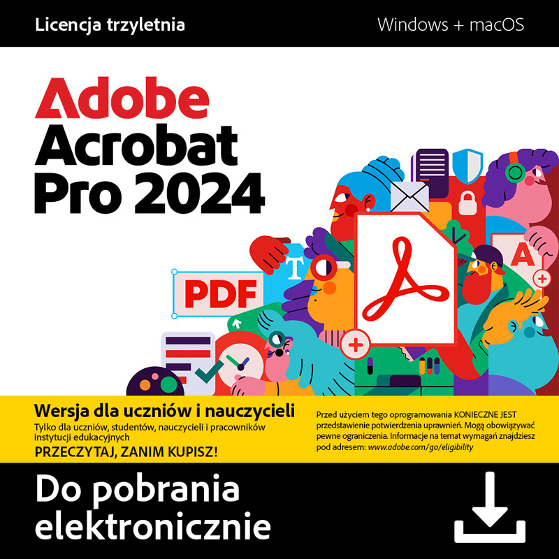 Otwórz nowe możliwości pracy z dokumentami PDF dzięki Adobe Acrobat Pro 2024 EDU! Wybierz najnowszą wersję legendarnego programu, która zapewnia pełną kontrolę nad plikami PDF, bezpieczną edycję, wygodne zarządzanie oraz jednorazową licencję na aż 3 lata. Intuicyjny interfejs, zaawansowane funkcje i wsparcie techniczne producenta sprawią, że nauka, praca oraz realizacja projektów będą szybsze i łatwiejsze niż kiedykolwiek!